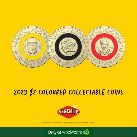 Coloured $2 coin featuring a VEGEMITE on toast as its focal point, surrounded by a black ring. The words "VEGEMITE CENTENARY" sit above the ring, with the words “Tastes like Australia” sitting below.