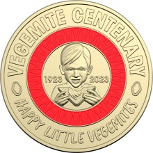 Coloured $2 coin featuring a child eating VEGEMITE on toast as its focal point, surrounded by a red ring. The words "VEGEMITE CENTENARY" sit above the ring, with the words “Happy Little VEGEMITES” sitting below.
